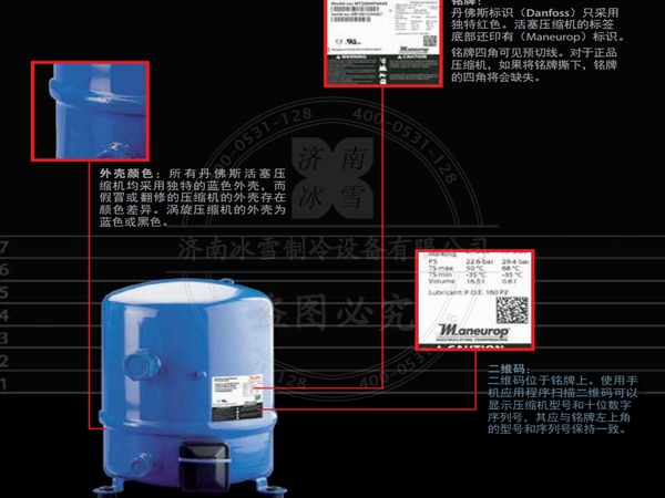 2、銘牌:丹佛斯標(biāo)識(shí)(Danfoss)只采用獨(dú)特紅色。美優(yōu)樂活塞壓縮機(jī)的標(biāo)簽底部還印有(Maneurop)標(biāo)識(shí)。銘牌四角可見預(yù)切線。對(duì)于正品壓縮機(jī),如果將銘牌撕下,銘牌的四角將會(huì)缺失。