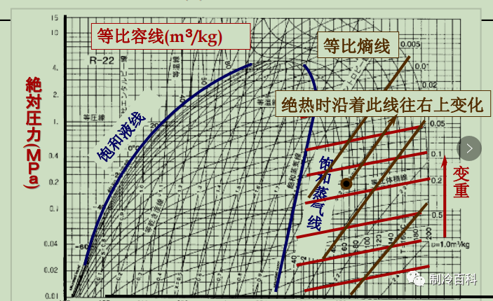 壓焓圖它是冷媒的地圖,表示了冷媒的熱力學(xué)性質(zhì)(壓力.溫度.熱量等),壓一焓圖繪制了制冷循環(huán)冷媒的狀態(tài)變化,根據(jù)該圖可以計(jì)算出制冷量.冷凝熱量,可以判斷出制冷設(shè)備的運(yùn)行狀態(tài)。